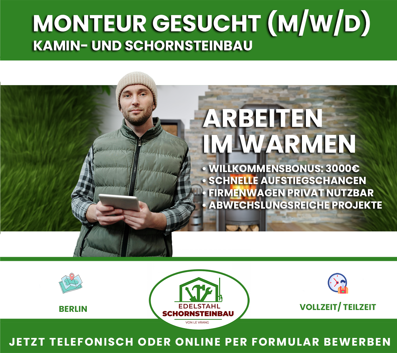• Abgeschlossene Ausbildung: Ofenbauer, Schornsteinfeger, Anlagenmechaniker (SHK)